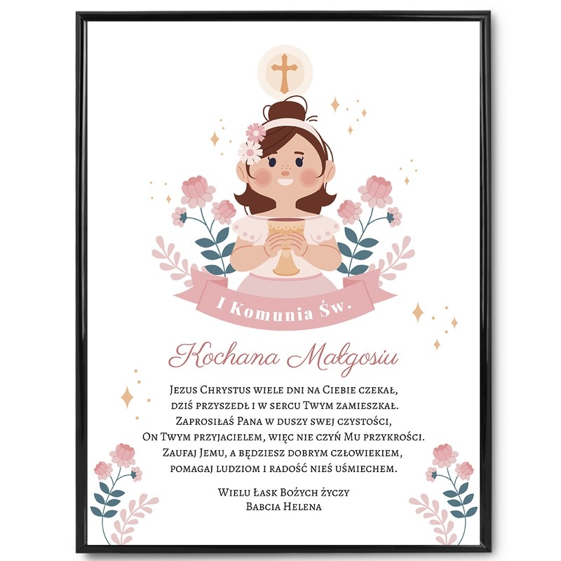 Proponujemy państwu wyjątkowy plakat, który stanie się piękną pamiątką Komunii. Piękna grafika w postaci dziewczynki przystępującej do komunii w otoczeniu różowych kwiatków sprawia, że plakat z pewnością spodoba się dziewczynce. Pod napisem I Komunia Św. znajduje się miejsce na imię dziecka, życzenia i podpis wręczającej prezent osoby. Dzięki prostemu i intuicyjnemu edytorowi na naszej stronie, z łatwością stworzą państwo swój projekt. Plakat umieszczamy w aluminiowej ramce ze szklaną szybą, którą charakteryzuje wysoka estetyka i elegancja.