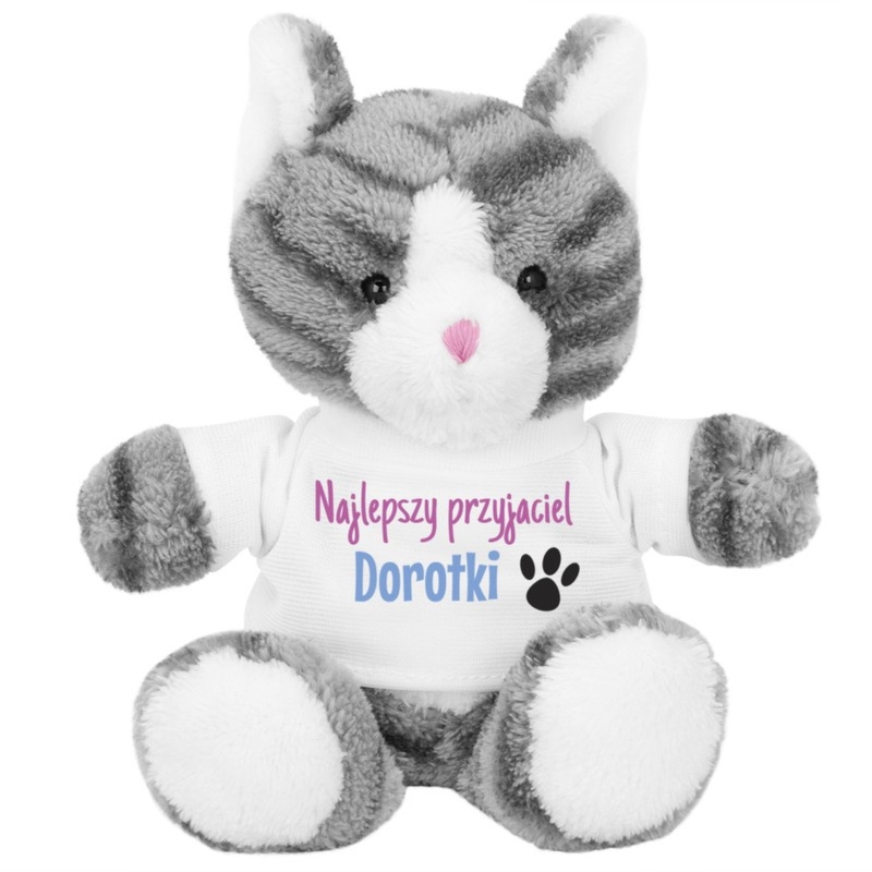 Pluszowy kotek 18 cm w białej koszulce z nadrukiem (tekst, grafika, zdjęcie). Materiał: plusz, poliester. Prezent na roczek, urodziny i Walentynki.
