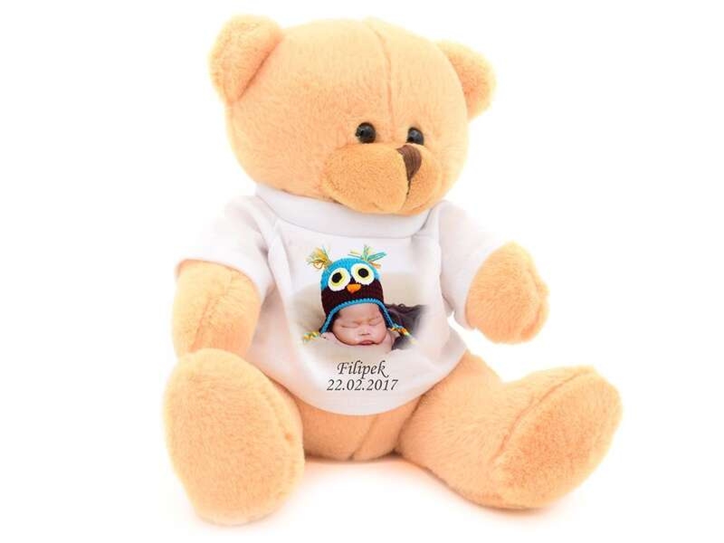 Śliczna maskotka z dowolnym nadrukiem na koszulce. Wyjątkowy prezent na Walentynki, urodziny i roczek – z możliwością umieszczenia zdjęcia.