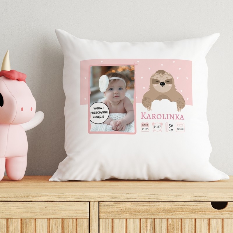 Nadruk na poduszce wykonujemy metodą sublimacji, która charakteryzuje się wysoką estetyką i trwałością, dzięki czemu nadruk nie ściera się, przez długi czas zachowując swój piękny wygląd. Na poduszeczce znajduje się miejsce na zdjęcie dziecka i metryczkę, dzięki czemu będzie to zarówno uroczy prezent dla maluszka, który będzie mógł przytulić się do poduszki, jak i piękna pamiątka dla młodych rodziców. Delikatne odcienie różu sprawiają, że będzie to idealny prezent dla dziewczynki. Prosty i intuicyjny edytor w naszym sklepie sprawi, że z łatwością stworzą państwo swój projekt.