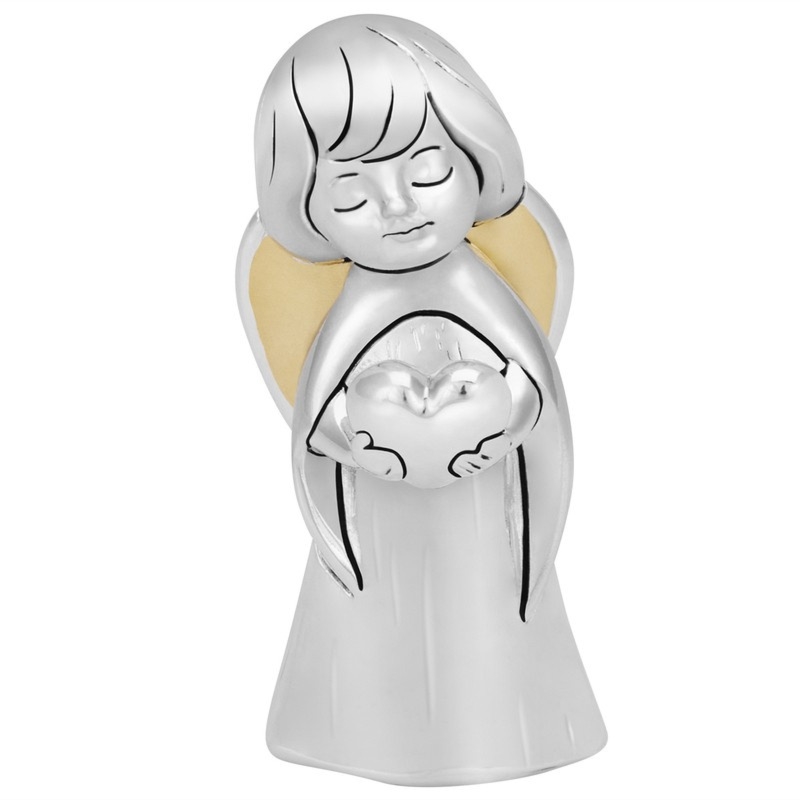Ręcznie robiona posrebrzana figurka aniołka z sercem – symboliczna pamiątka na Chrzest i inne okazje. W zestawie opakowanie producenta.