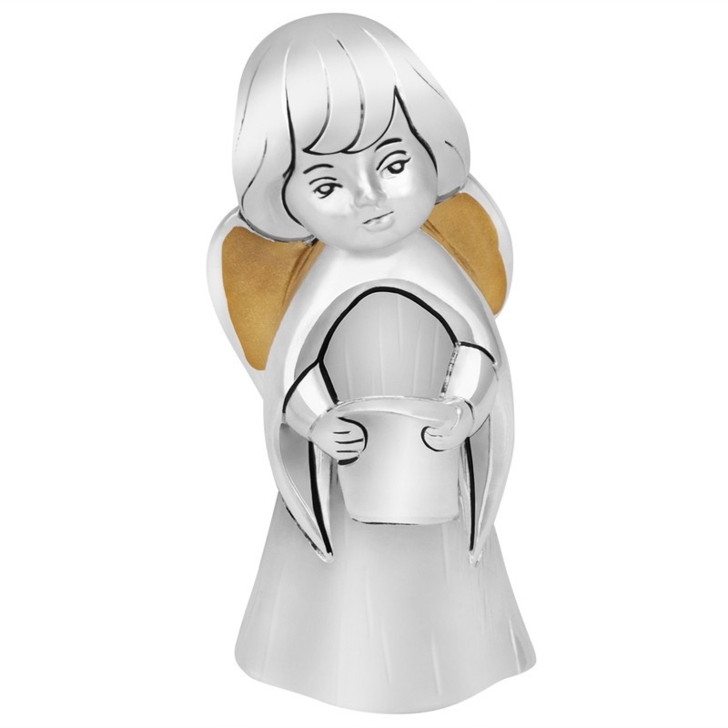 Posrebrzana figurka aniołka ze zwojem, ręcznie wykonana, w oryginalnym opakowaniu – pamiątka Chrztu i Komunii