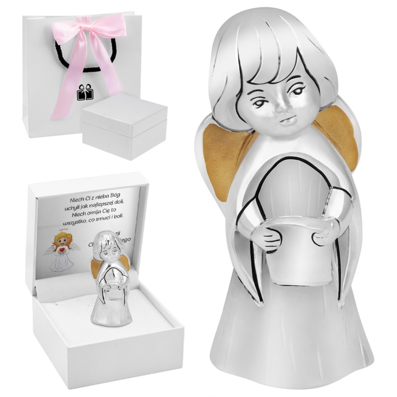 Ręcznie robiona posrebrzana figurka aniołka ze zwojem z tabliczką z dedykacją (grawer życzeń i grafiki). W zestawie białe pudełeczko i torebka prezentowa ze wstążką.