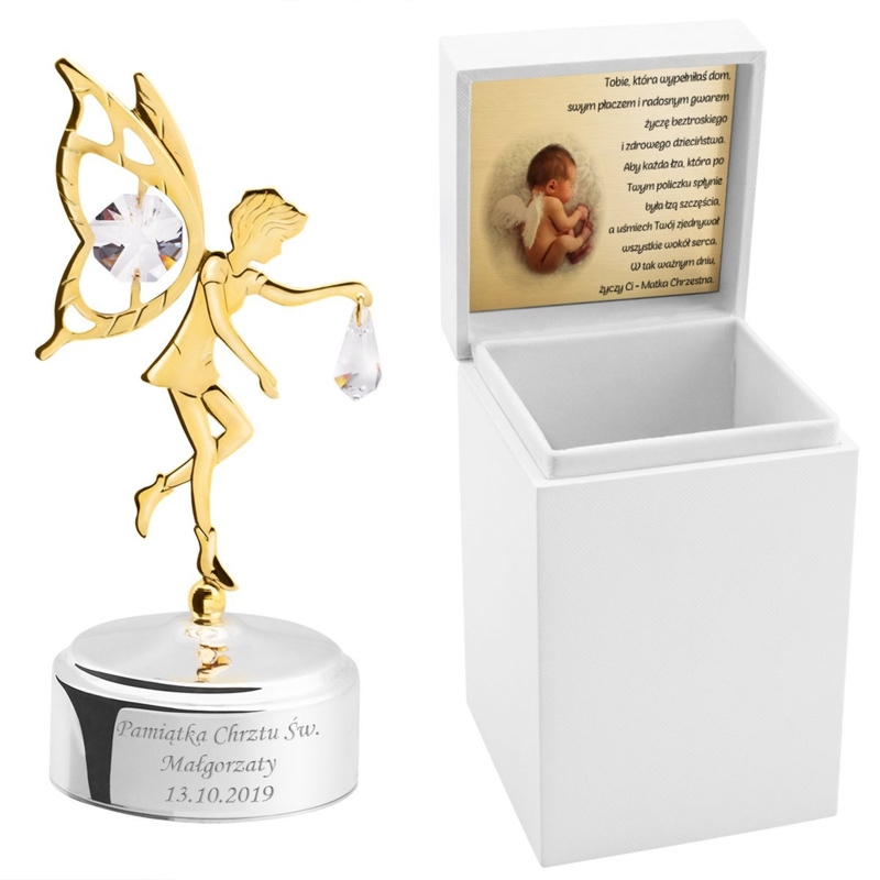 Posrebrzana mała pozytywka z pozłacanym Elfem Swarovskiego, grawerem laserowym z przodu podstawy i melodią It’s a small world