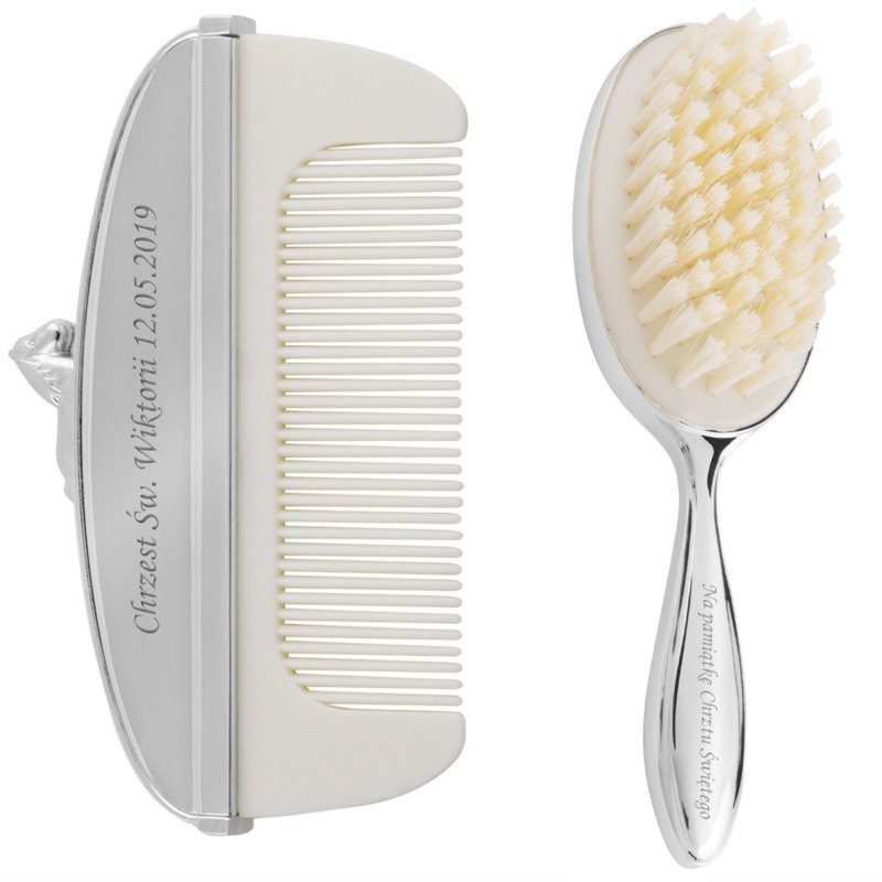 Posrebrzany grzebyk i szczoteczka z motywem konika – pamiątka na Chrzest z indywidualnym grawerem, w oryginalnym pudełku producenta.