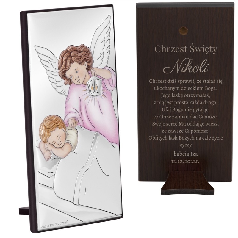 Proponujemy państwu wyjątkową pamiątkę chrztu – obrazek przedstawiający Anioła Stróża czuwającego przy dziecku. Przednia część produktu jest stała i nie podlega modyfikacjom. Na odwrocie wykonamy personalizowany grawerunek zgodnie z państwa projektem. Imię dziecka, życzenia, czy cytat z biblii sprawią, że prezent stanie się wyjątkową i niepowtarzalną pamiątką. Grawerunek nanosimy metodą laserową, która charakteryzuje się wyjątkową precyzją i trwałością.