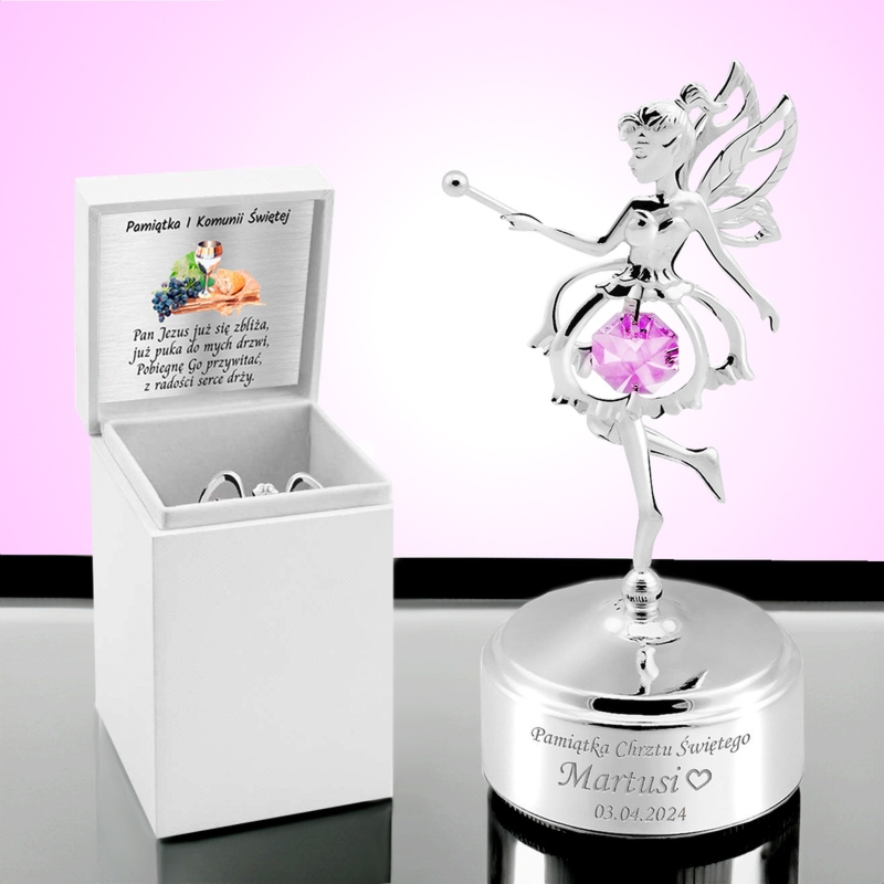 Posrebrzana pozytywka dziewczynka elf z różowym kryształem, grawerem z przodu podstawy i tabliczką dedykacyjną w ozdobnym pudełku