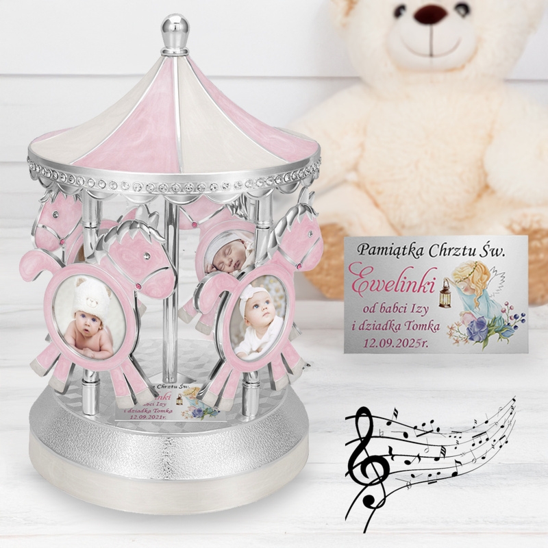Retro karuzela z konikami i dwustronnymi ramkami na zdjęcia; stal pokryta masą perłową i emalią, gra Rock a bye baby oraz ma tabliczkę z dedykacją
