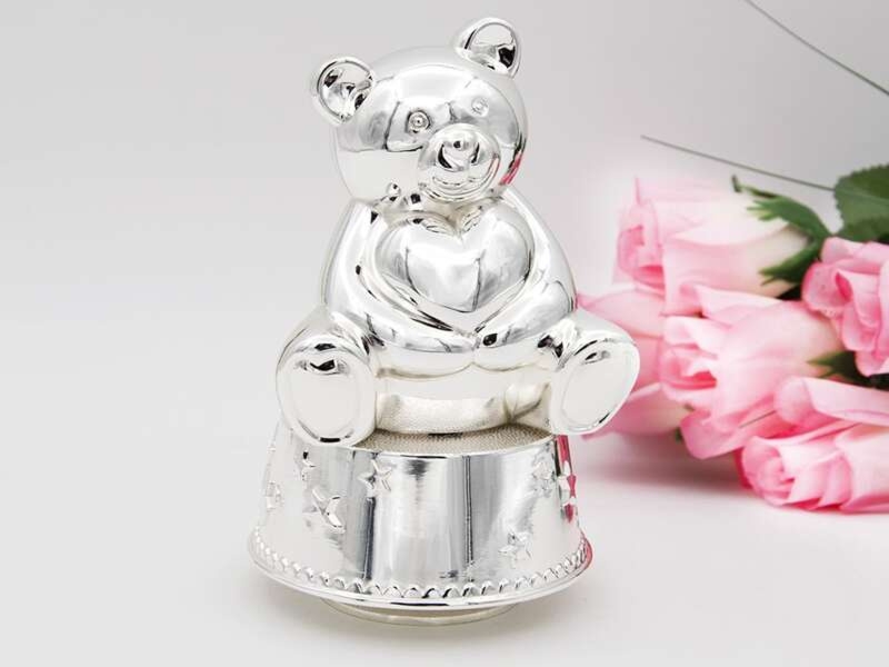 Posrebrzana pozytywka-skarbonka Miś z sercem, grawer laserowy na serduszku i melodia La Vie en Rose, w zestawie pudełeczko
