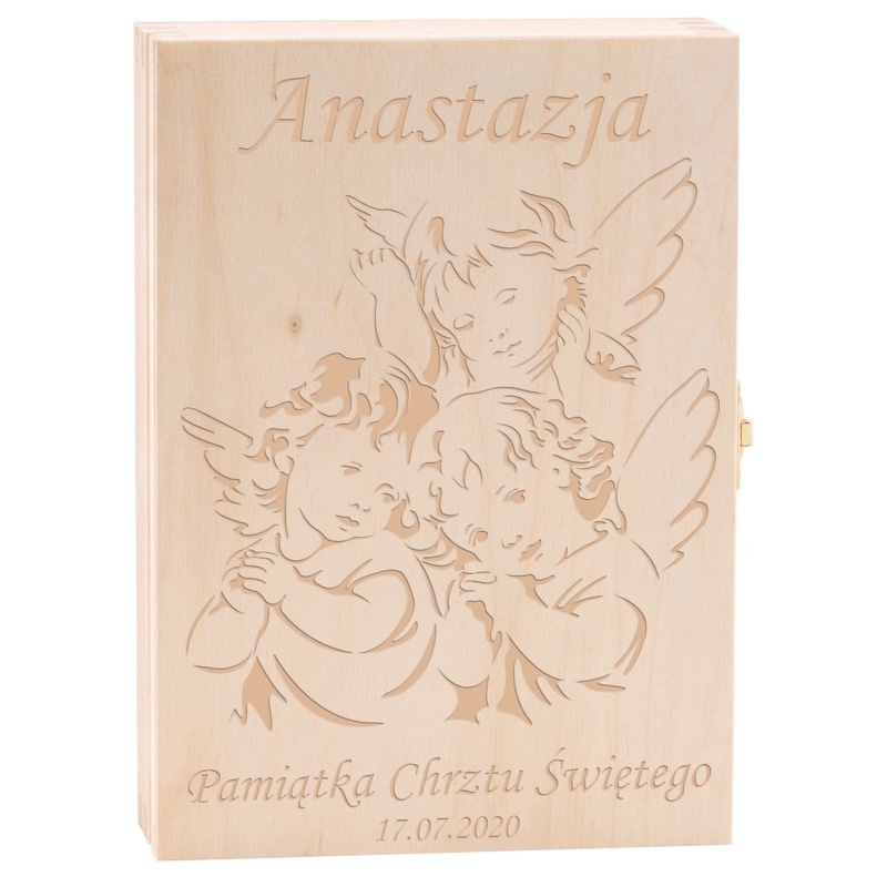 Naturalne, niemalowane pudełko na sztućce z jasnego drewna i jednostronnym grawerem laserowym na wieku, na chrzest lub roczek