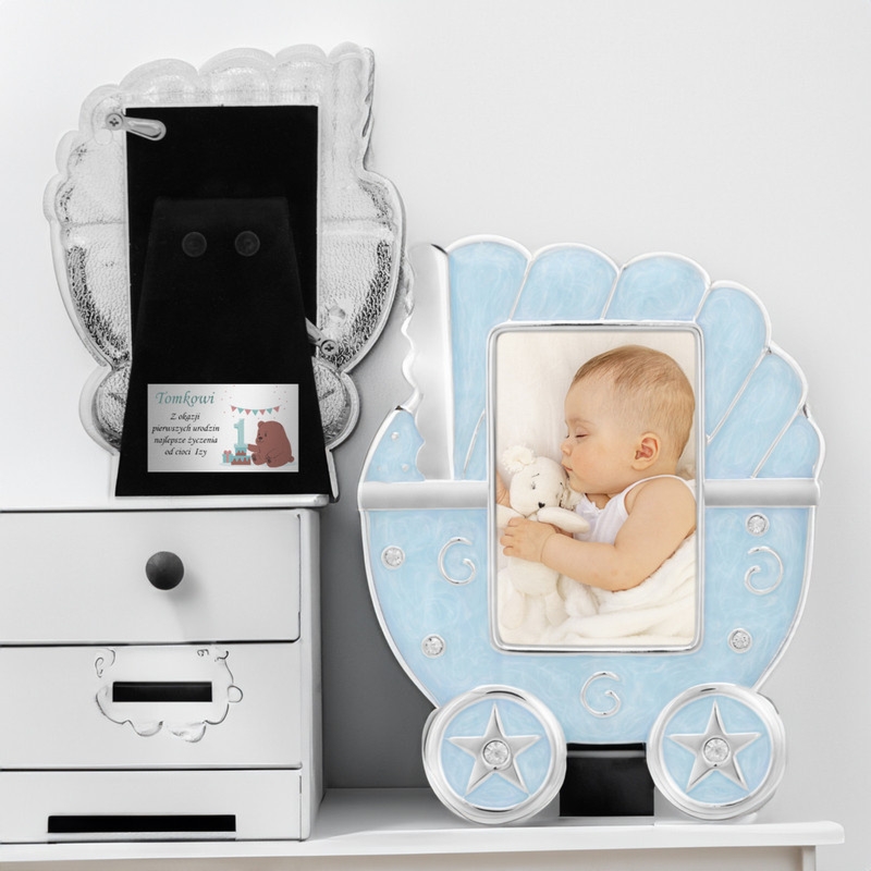 Błękitna ramka w kształcie wózka z cyrkoniami i tabliczką na dowolny nadruk. Pamiątka na chrzest lub roczek, zdjęcie wkładasz samodzielnie