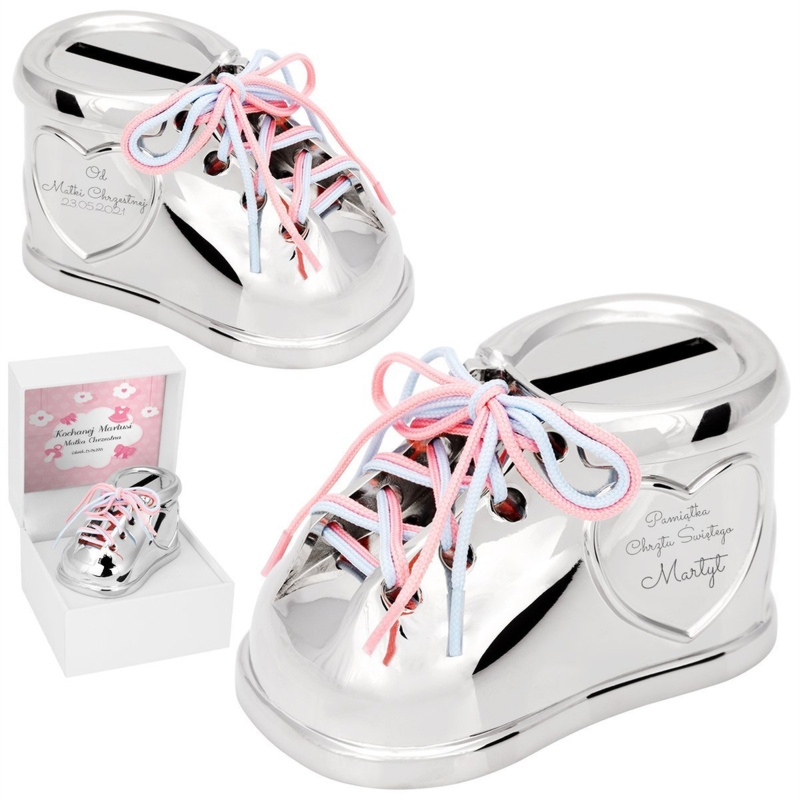 Posrebrzana skarbonka bucik z grawerem laserowym po obu stronach, w eleganckim pudełku z metalową tabliczką do dedykacji