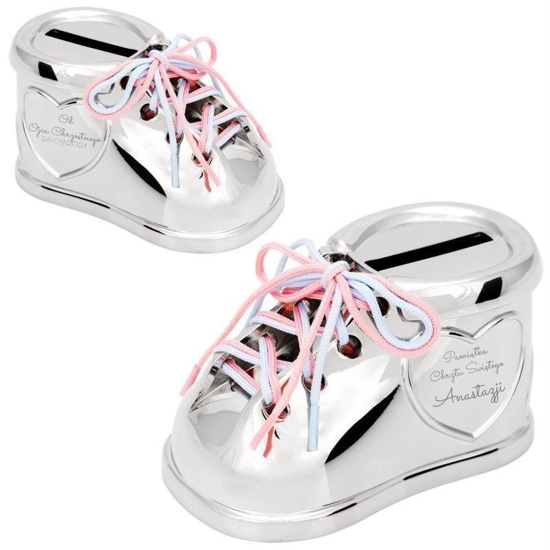 Posrebrzana skarbonka bucik z grawerem laserowym w serduszkach po obu stronach oraz wyborem różowej lub niebieskiej sznurówki