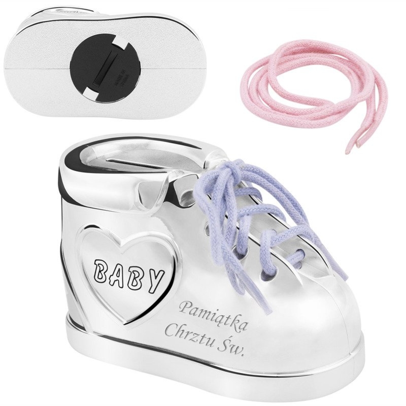 Posrebrzana skarbonka bucik z napisem BABY oraz grawerem jednostronnym z boku, w komplecie sznurówka niebieska i różowa oraz pudełko