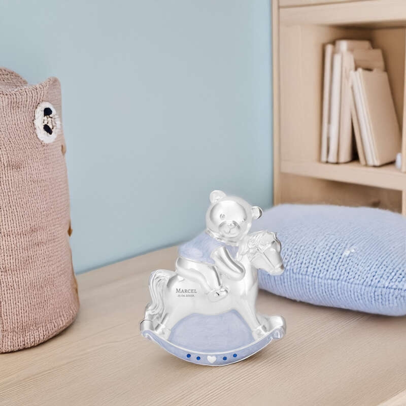 Posrebrzana skarbonka Miś na Koniku z grawerem laserowym imienia, daty lub krótkiego tekstu, z tekturowym opakowaniem producenta