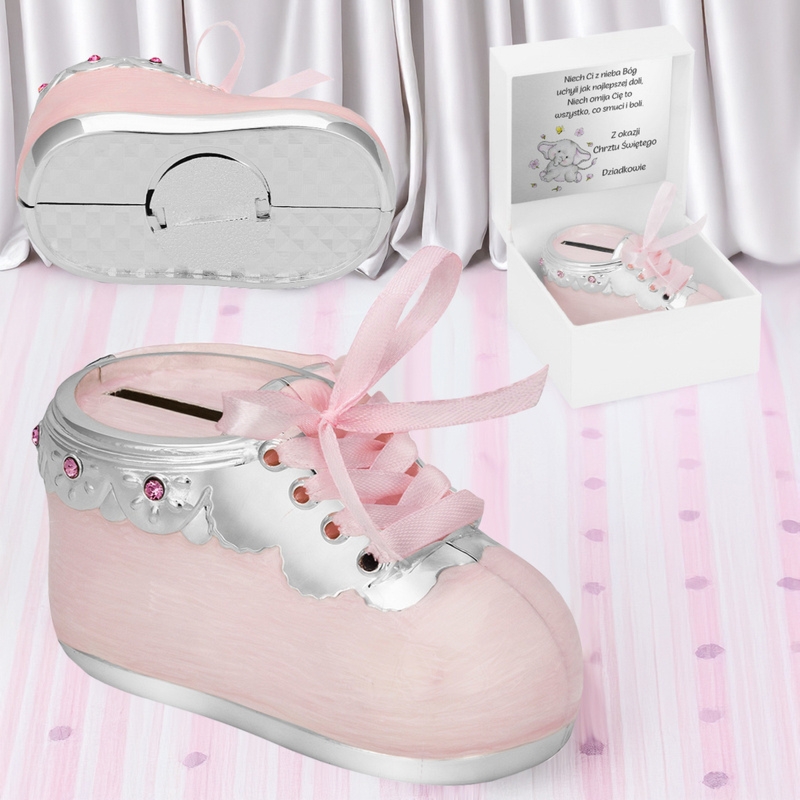 Różowa skarbonka bucik ze stali posrebrzanej i masy perłowej, z różowymi cyrkoniami oraz dedykacją w pudełku z wstążką