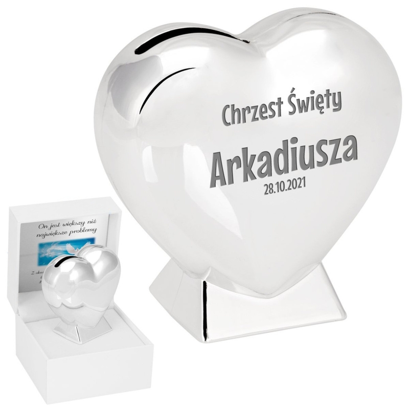 Posrebrzana skarbonka serce z otwieraniem, grawerem laserowym i tabliczką w pudełku na wierszyk, dedykację, grafikę lub zdjęcie