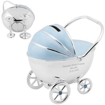 Skarbonka wózek błękitna posrebrzana z grawerem na chrzest
