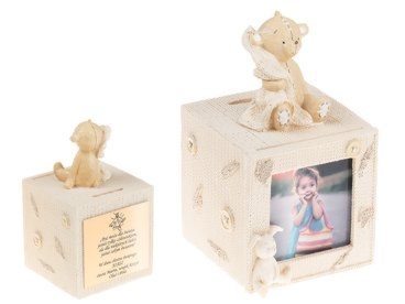 Skarbonka w żółto-beżowym kolorze z misiem, miejscem na zdjęcie i tabliczką z indywidualną dedykacją z tyłu