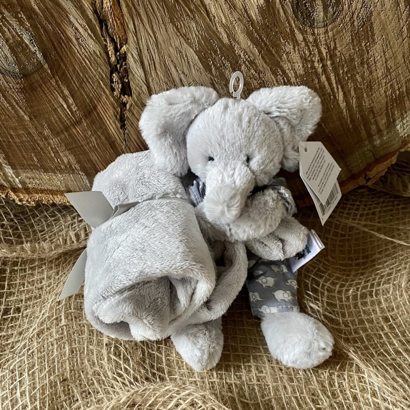 Słonik Jellycat w ubranku ze szmatką-przytulanką – ręcznie wykonany, szary, 18 cm, bezpieczny od urodzenia (0+), EN71.