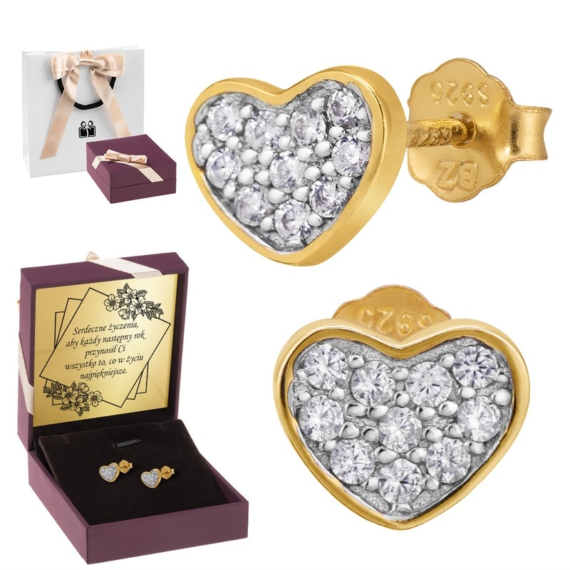 Drobna budowa kolczyków sprawia, że będą one świetnym prezentem dla kobiet, które preferuję delikatne, subtelne ozdoby. Pozłacana powłoka, którą są pokryte kolczyki nadaje ozdobie wyjątkowej klasy i elegancji. Drobne cyrkonie umieszczone w sercu sprawiają, że kolczyki nabierają wyjątkowego blasku. Wygodne zapięcie w postaci klasycznego sztyftu zapewnia wygodę noszenia i zabezpiecza kolczyki przed wypadnięciem. Próba srebra została potwierdzona cechą urzędu probierczego, która znajduje się na zatrzasku, dzięki czemu mają państwo pewność najwyższej jakości materiałów, z których wykonane są kolczyki.