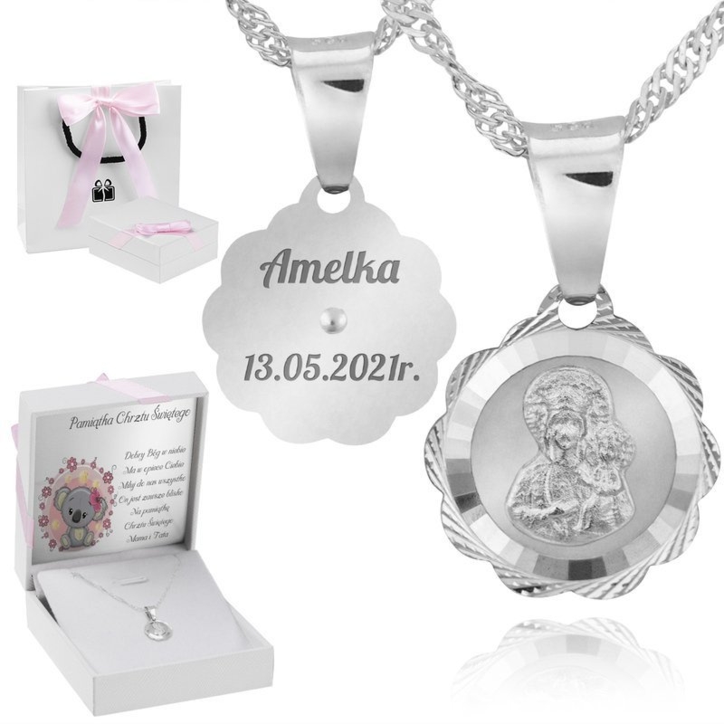 Srebrny medalik 925 Matka Boska Częstochowska z grawerem, łańcuszek singapur oraz pudełeczko z różową kokardką i tabliczką dedykacji