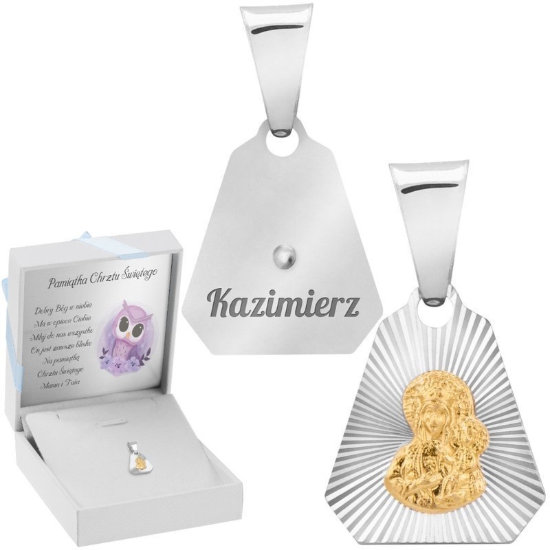 Srebrny medalik 925 z pozłacaną Matką Boską Częstochowską, grawer laserowy na odwrocie i białe pudełeczko z tabliczką dedykacji