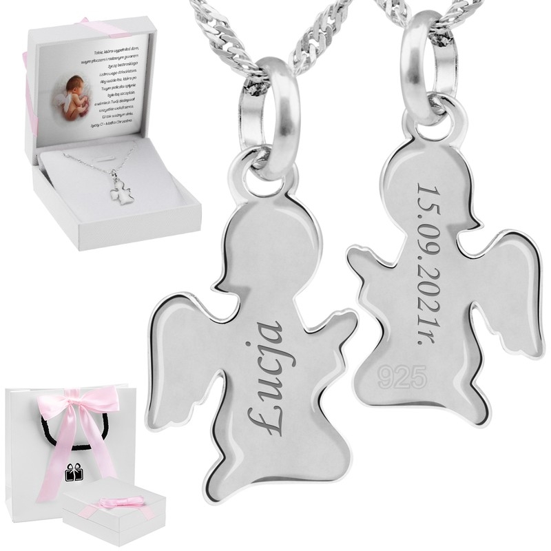 W zestawie znajduje się także łańcuszek srebrny próby 925, o splocie singapur. Łańcuszek doskonale prezentuje się z wisiorkami oraz medalikami. Dodatkowo komplet zostanie zapakowany w eleganckie pudełko z różową wstążką, oraz indywidualną dedykacją w środku!