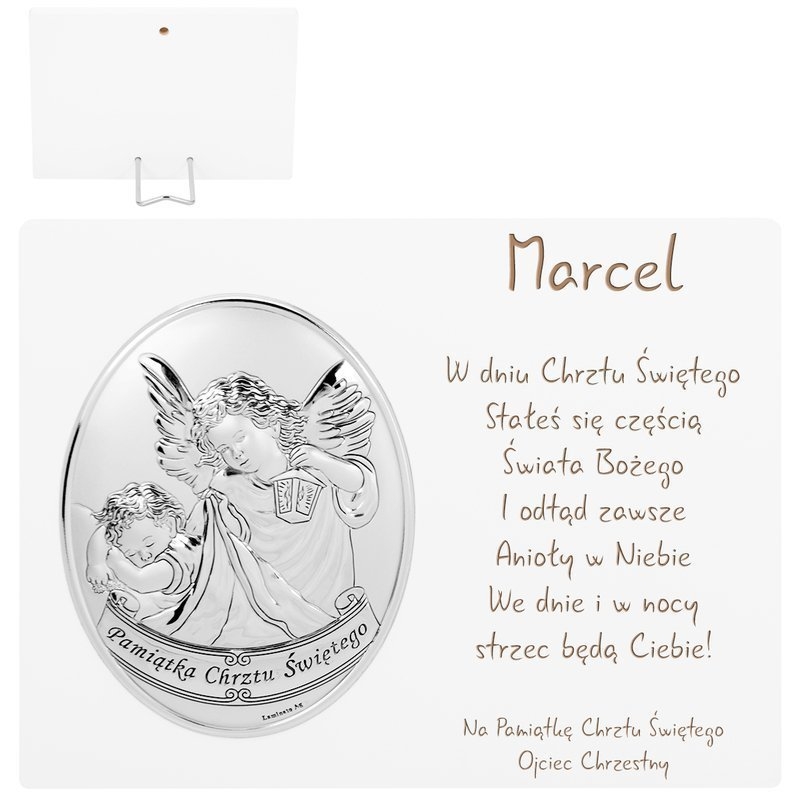 Obrazek został wykonany z drewnianej podstawy, pomalowanej na biało oraz ozdobiony posrebrzanym Aniołkiem ze stali MIRO-SILVER® pokrytej warstwą czystego srebra 999,95. Metal ten posiada wyjątkowe cechy: jest odporniejszy na odkształcenia mechaniczne i śniedzenie niż metale pozyskiwane tradycyjnie, doskonale odbija światło, co podkreśla szlachetność srebra. Na płaskorzeźbie został umieszczony napis “Pamiątka Chrztu Świętego”.