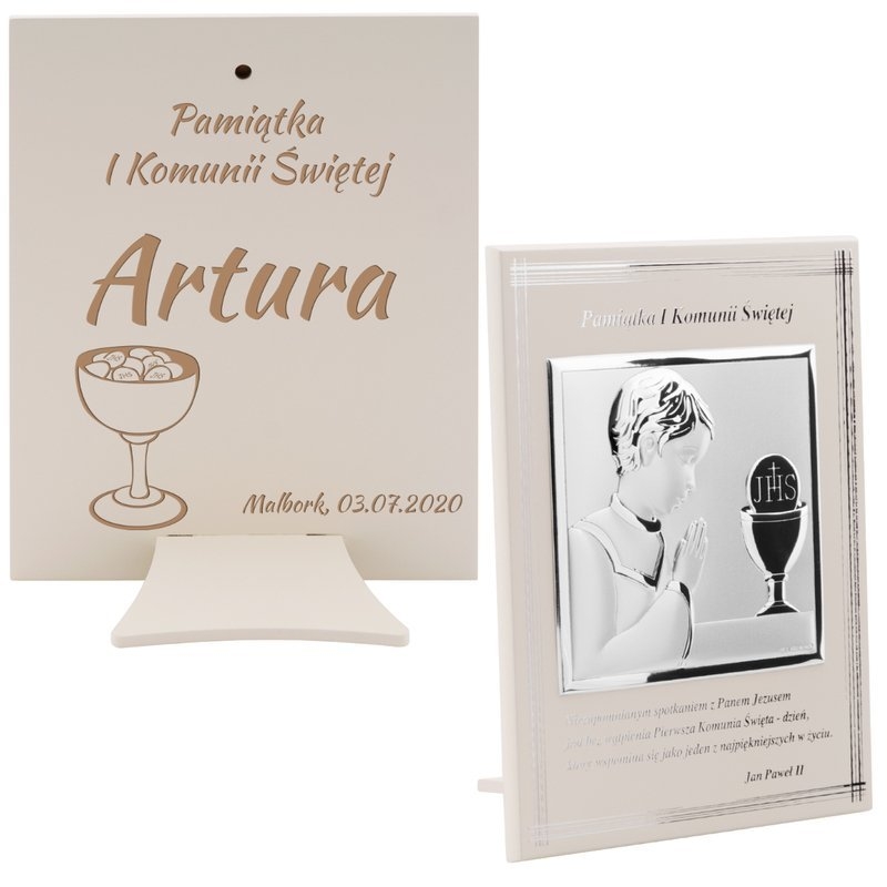 Napisz pierwszą opinię o „Srebrny obrazek chłopiec pamiątka na I Komunię Św. Grawer”