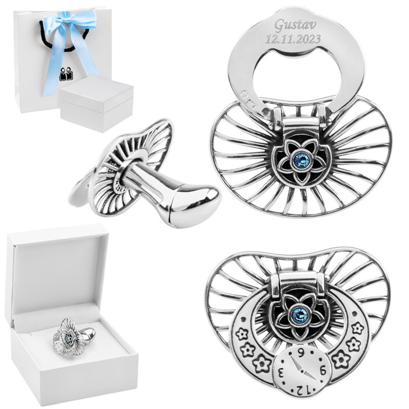 Srebrny smoczek pr. 0,925 z niebieskim kamykiem – pamiątka na Chrzest, narodziny lub roczek. W cenie grawer diamentem: na rączce (max 20 znaków) + godzina na tarczy zegara. Schowek z „klapką” na pierwszy ząbek.