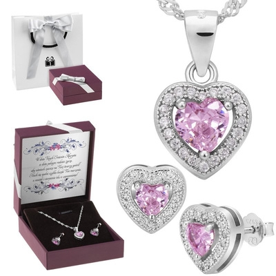 Srebrne kolczyki i wisiorek z różowymi cyrkoniami, to idealny wybór na prezent dla kobiety z okazji: rocznicy ślubu, urodzin, Dnia Matki itp. Dzięki swojemu uniwersalnemu wzornictwu, zestaw doskonale sprawdzi się również jako wyjątkowy podarunek dla dziewczynki na I Komunie Św., Bierzmowanie czy urodziny.