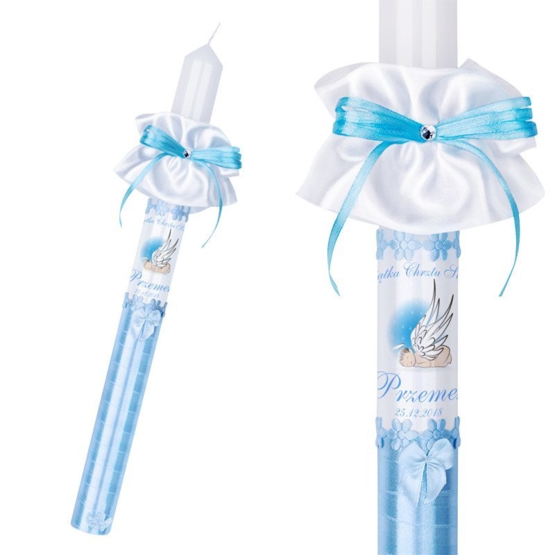 Ręcznie zdobiona świeca do Chrztu lub Komunii z indywidualnym nadrukiem zdjęcia, grafiki lub dedykacji. W zestawie profitka i okapnik