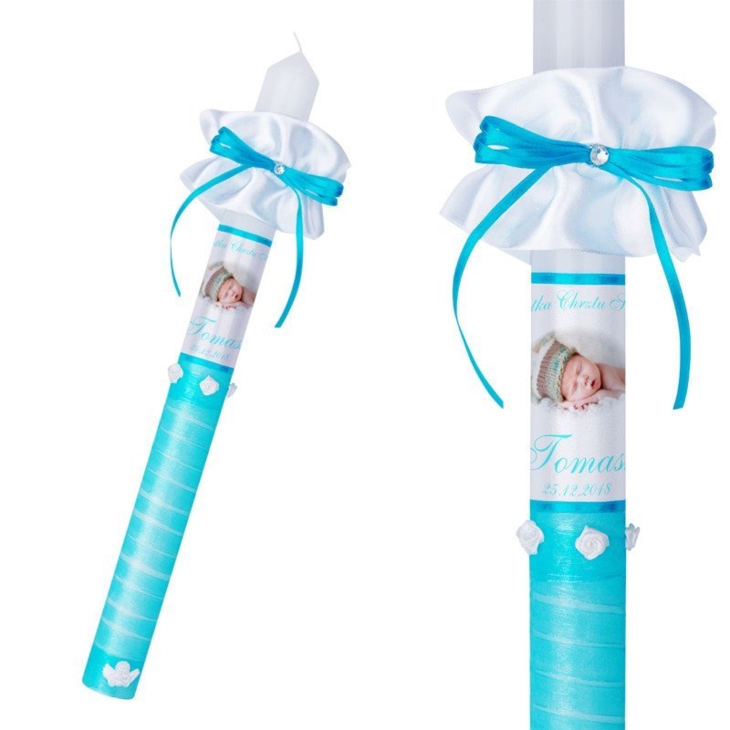 Ręcznie zdobiona świeca do Chrztu lub Komunii ze zdjęciem dziecka, grafiką lub dedykacją, z profitką i okapnikiem w zestawie