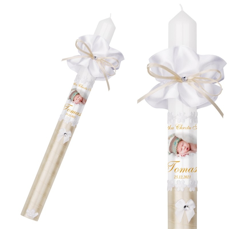 Świeca G20 do Chrztu i Komunii z nadrukiem zdjęcia dziecka lub grafiki i napisów, ręcznie zdobiona, w zestawie profitka