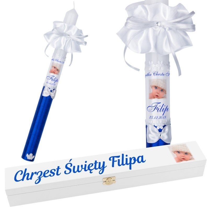 Świeca G10 na Chrzest i Komunię ze zdjęciem lub grafiką oraz biała skrzynka z nadrukiem UV i dowolnym nadrukiem na wieku
