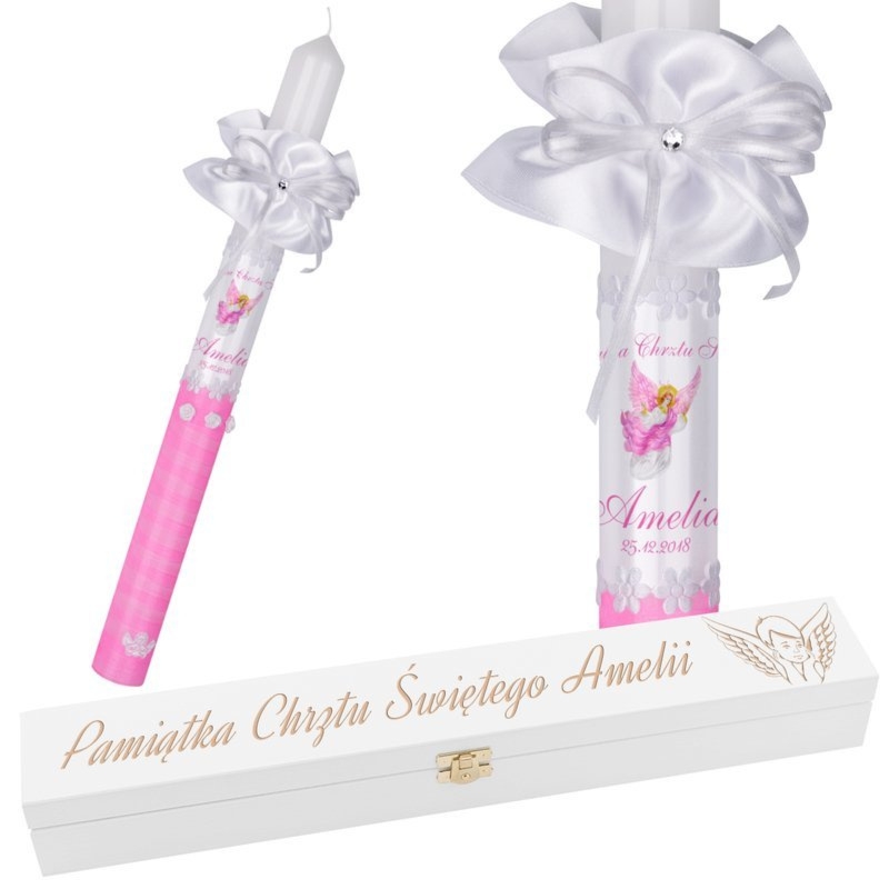 Model G18: ręcznie zdobiona świeca na Chrzest lub Komunię z nadrukiem zdjęcia lub grafiki oraz skrzynką z grawerem na wieku