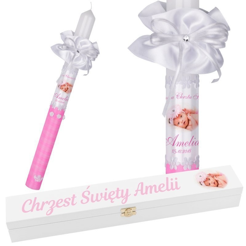 Świeca G18 na Chrzest lub Komunię ze zdjęciem lub grafiką oraz biała skrzynka z nadrukiem UV i dowolnym nadrukiem na wieku bez limitu znaków