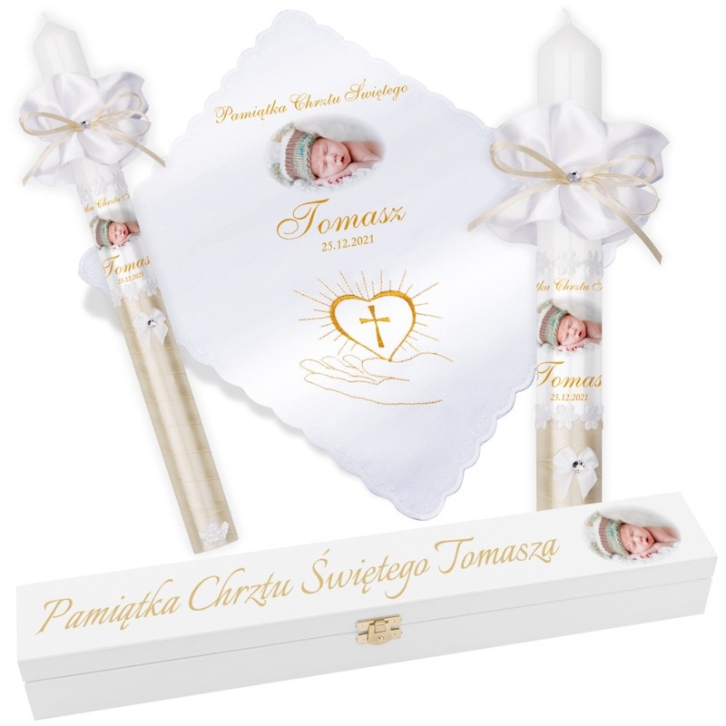 Personalizowana świeca i szatka do Chrztu lub Komunii ze zdjęciem, w białej skrzynce z nadrukiem UV oraz dowolnym nadrukiem na wieku