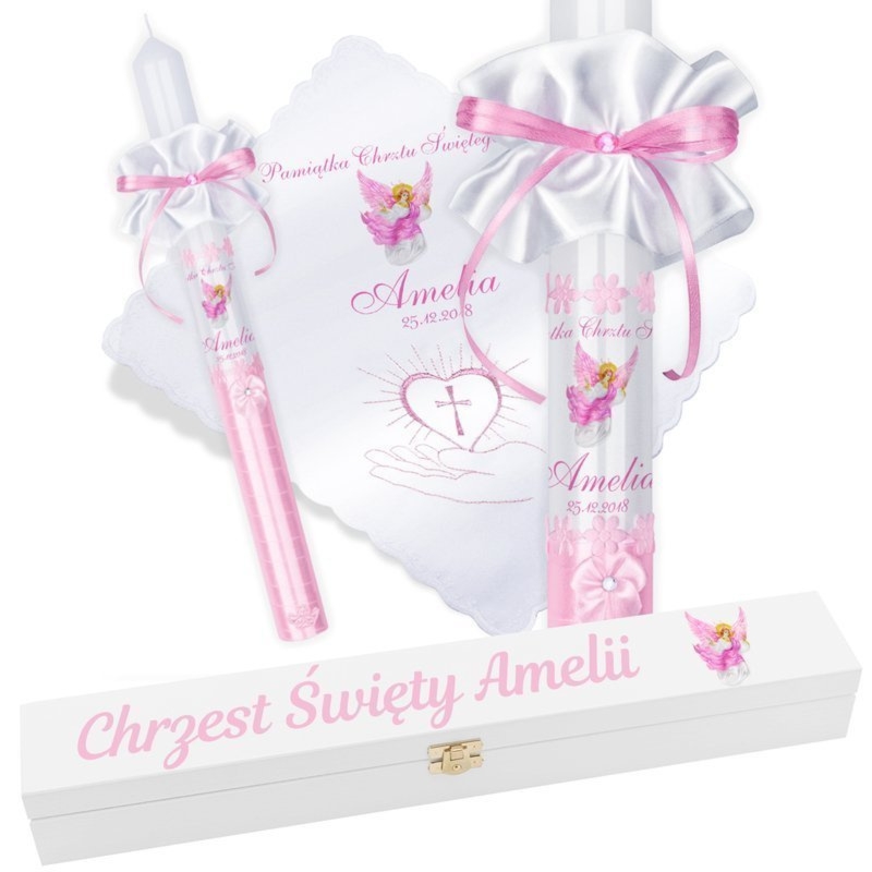 Zestaw świecy i różowej szatki do Chrztu/Komunii ze zdjęciem lub grafiką oraz skrzynką z nadrukiem UV