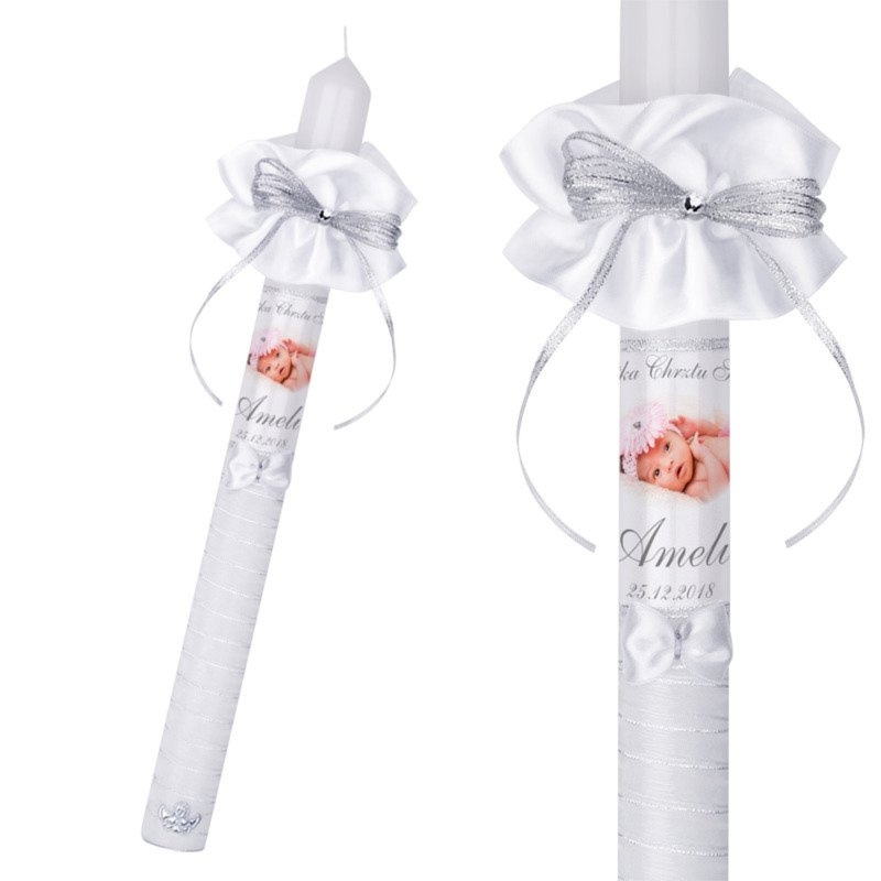 Ręcznie zdobiona świeca na Chrzest lub Komunię z nadrukiem zdjęcia lub grafiki i napisów, w zestawie profitka oraz okapnik