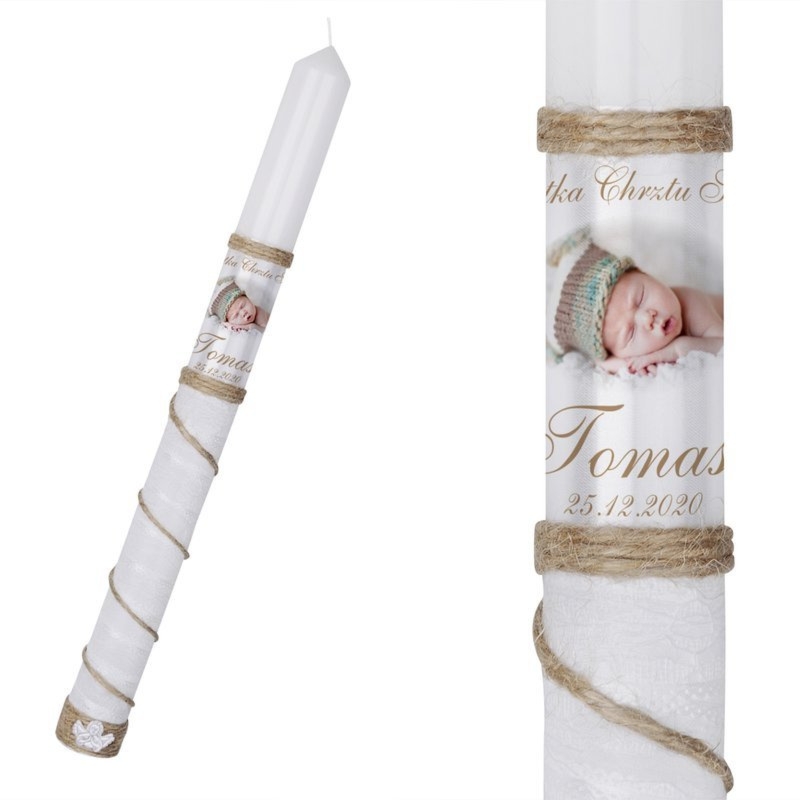 Świeca do chrztu ze zdjęciem lub grafiką, ręcznie zdobiona koronkową tasiemką i brązowym sznurkiem, z nadrukiem napisów