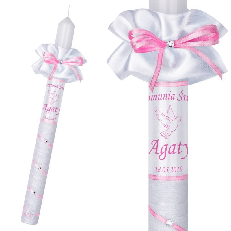 Ręcznie zdobiona świeca do Komunii z różowymi dodatkami oraz indywidualnym nadrukiem grafiki i napisów, z profitką i okapnikiem