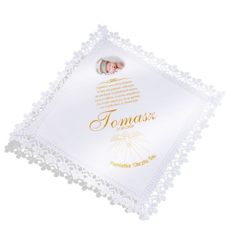 Szatka do Chrztu z koronką, złotym haftem Ducha Świętego i napisem Pamiątka Chrztu Św., z indywidualnym nadrukiem zdjęcia lub grafiki