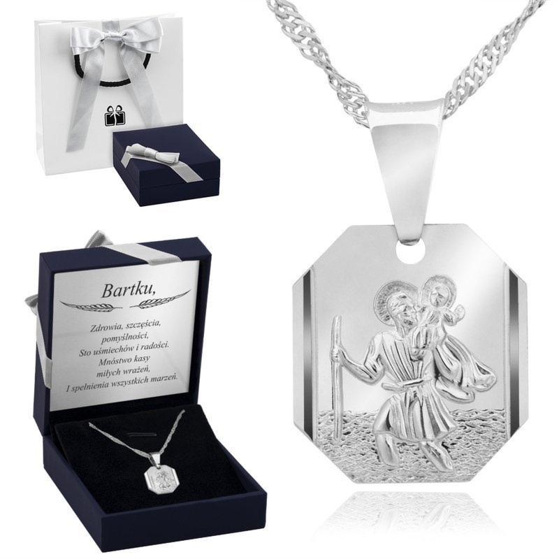 Srebrny medalik 925 ze Św. Krzysztofem w komplecie z łańcuszkiem Singapur, pudełkiem z kokardką, torebką i dedykacją