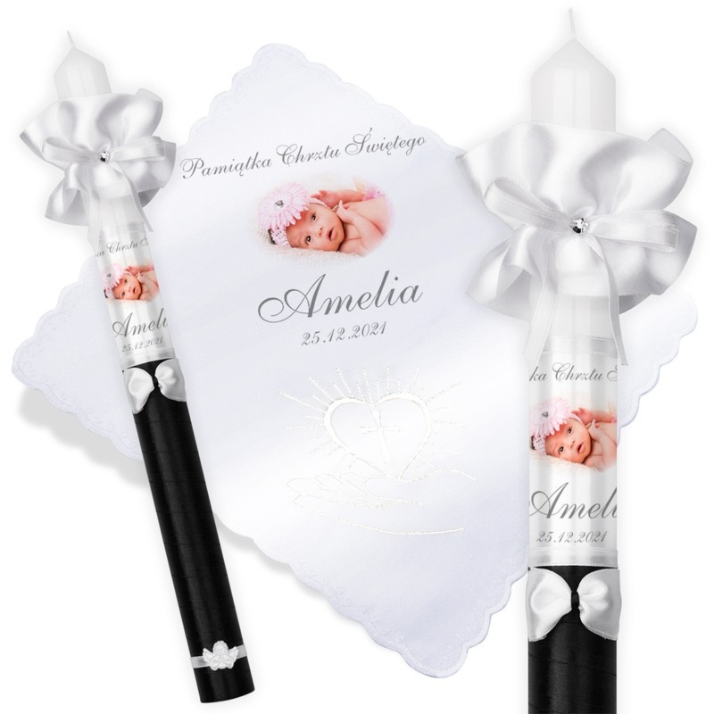 Czarna świeca i szatka do chrztu z nadrukiem zdjęcia lub grafiki oraz imieniem i datą, z białą profitką i plastikowym okapnikiem