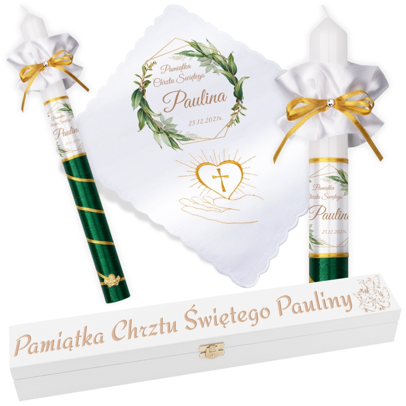 Zestaw: świeca i szatka G25 ze zdjęciem dziecka oraz pudełko do przechowywania z grawerem laserowym i nadrukiem metodą sublimacji