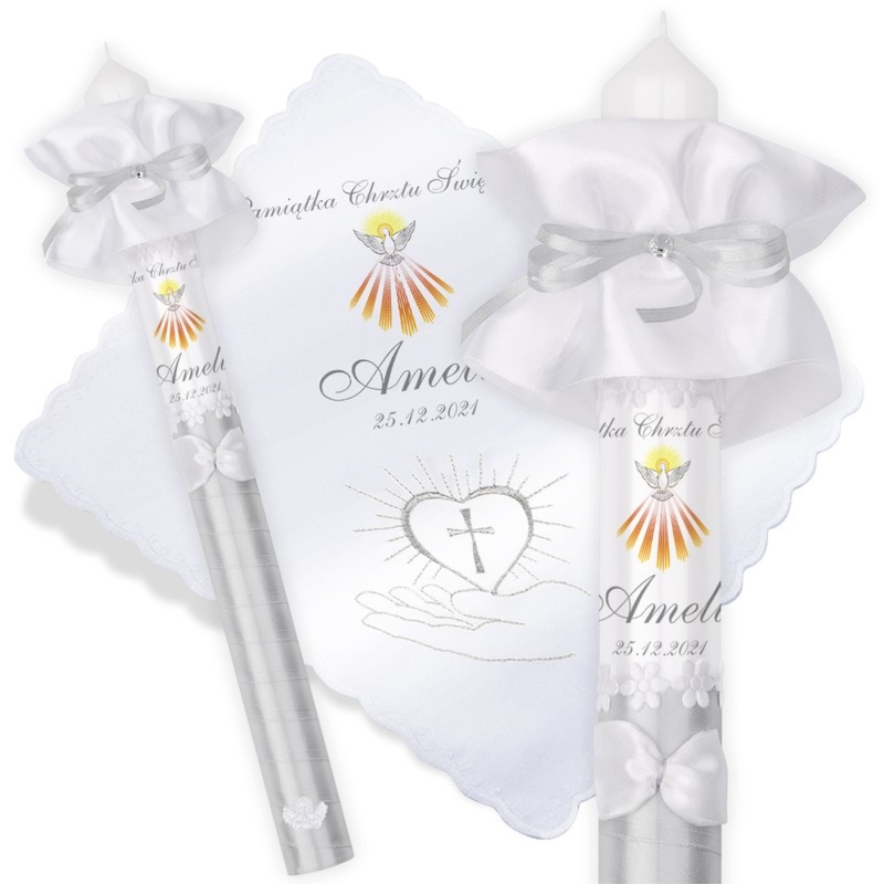 Zestaw świeca i szatka na Chrzest lub Komunię z nadrukiem zdjęcia, grafiki lub dedykacji na obu elementach