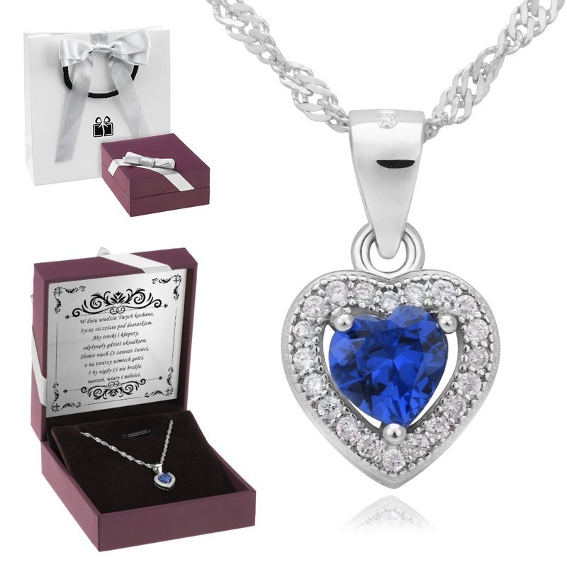 - Srebrny wisiorek w kształcie serca z niebieską cyrkonią.