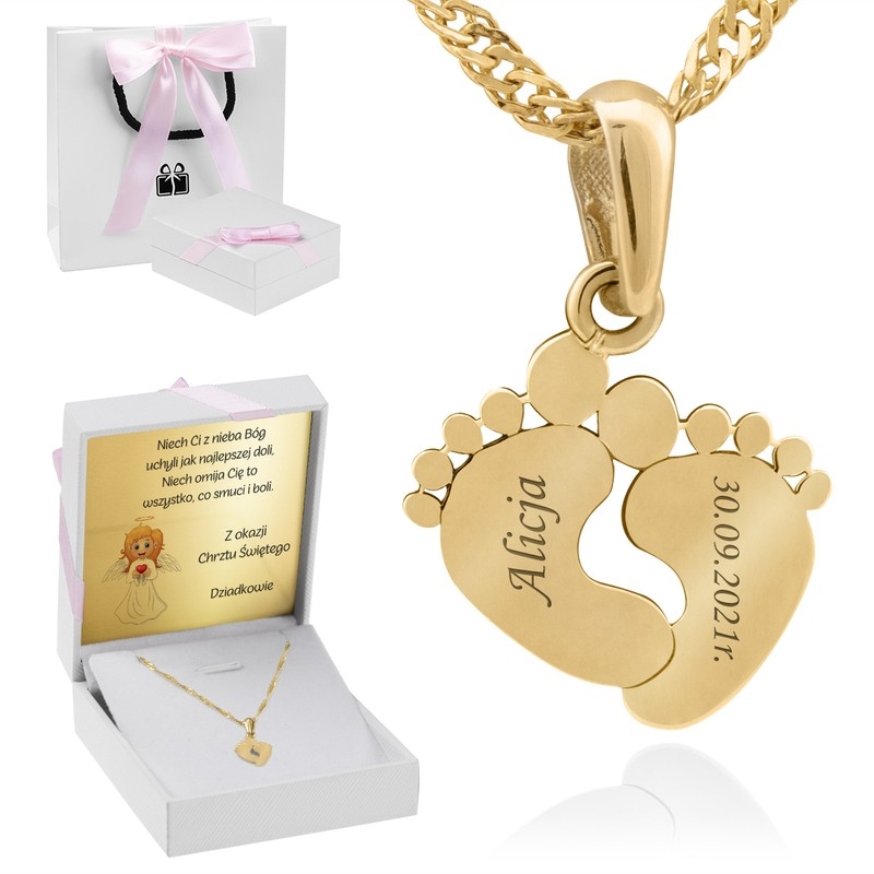 Złoty wisiorek w kształcie dziecięcych stópek. Biżuteria została wykonana z najwyższej jakości złota próby 585. Świadczą o tym dołączone metki jubilerskie oraz wybita na wisiorku próba, zbadana przez Polski Urząd Probierczy.